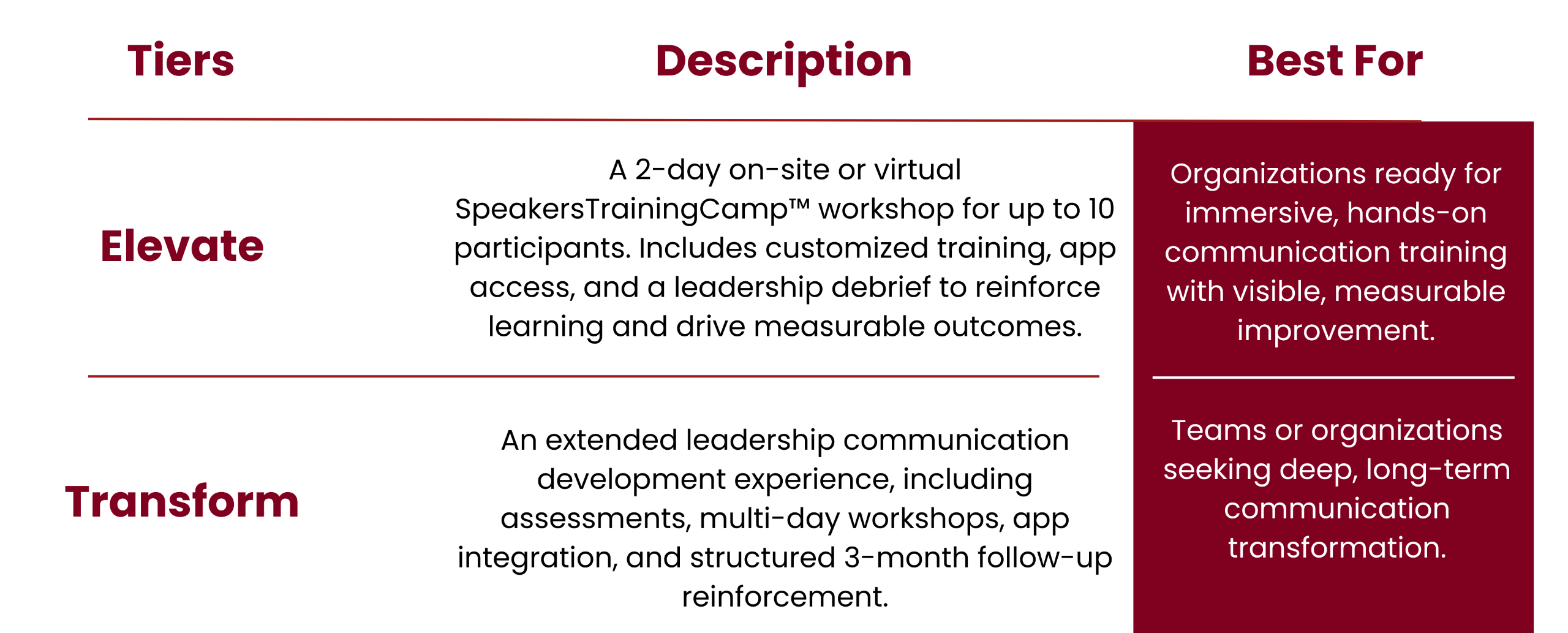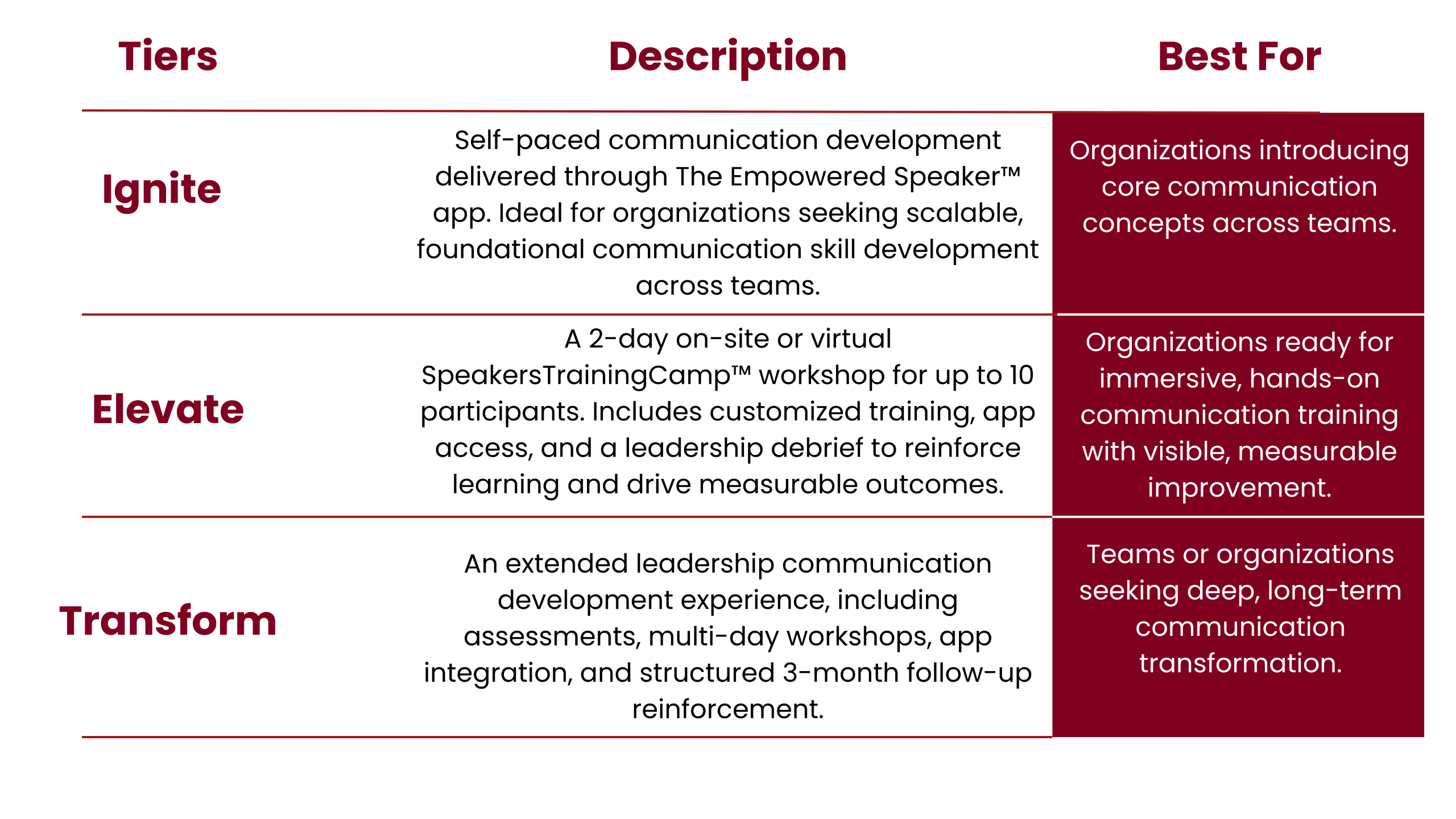 Equip your leaders and teams with the structured communication tools they need to speak with clarity, credibility, and impact. Whether you’re seeking scalable foundational development or an immersive, hands-on training experience, the SpeakersTrainingCamp™ offers a solution aligned to your organization’s goals.